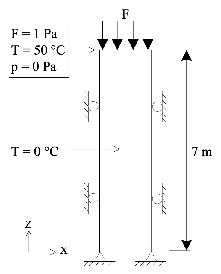 We simulate the consolidation of 1D thermoporoelastic column subjected to a surface traction stress of 1 Pa applied on the top surface, with a surface temperature of 50 degrees Celsius and a pore pressure of 0 Pa. The initial temperature of the saturated soil is 0 degrees Celsius. The soil column is insulated and sealed everywhere, except at the top surface. The problem setup is illustrated below.