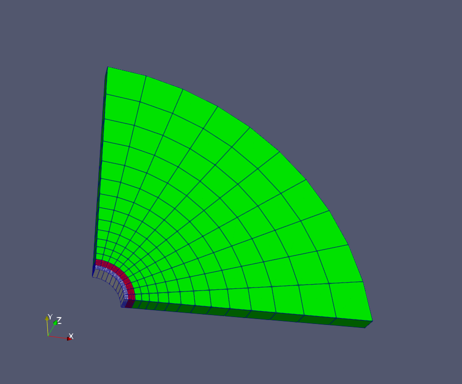 The internal wellbore mesh generator InternalWellbore is employed to create the mesh of this wellbore problem. The radii of the casing cylinder, the cement sheath cylinder and the far-field boundary of the surrounding rock formation are defined by a vector radius. In the tangent direction, theta angle is specified from 0 to 90 degrees to simulate the problem on a quarter of the wellbore geometry. The problem is under plane strain condition and therefore we only consider radial thermal diffusion on a single horizontal layer. The trajectory of the well is defined by trajectory, which is vertical in this case. The autoSpaceRadialElems parameters allow for optimally increasing the element size from the wellbore to the far-field zone. In this example, the auto spacing option is only applied to the rock formation. The useCartesianOuterBoundary with a value 3 specified for the rock layer transforms the far-field boundary to a circular shape. The cellBlockNames and elementTypes define the regions and related element types associated to casing, cement sheath, and rock.
