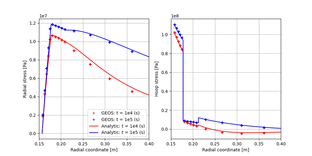 The validations of the total radial and hoop stress (tangent stress) components computed by GEOS against reference results are shown in the figure below:
