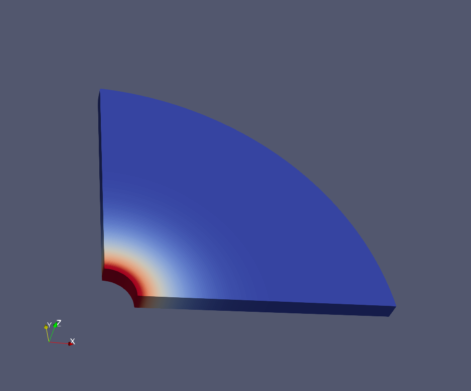 This example uses the thermal single-phase flow solver to model a pure thermal diffusion problem around a wellbore. To mimic this specific problem, thermal convection and fluid flow are neglected by setting fluid pressure and fluid heat capacity to zero. With a uniform temperature applied on the inner surface of the wellbore, temperature field would radially diffuse as shown in the figure below: